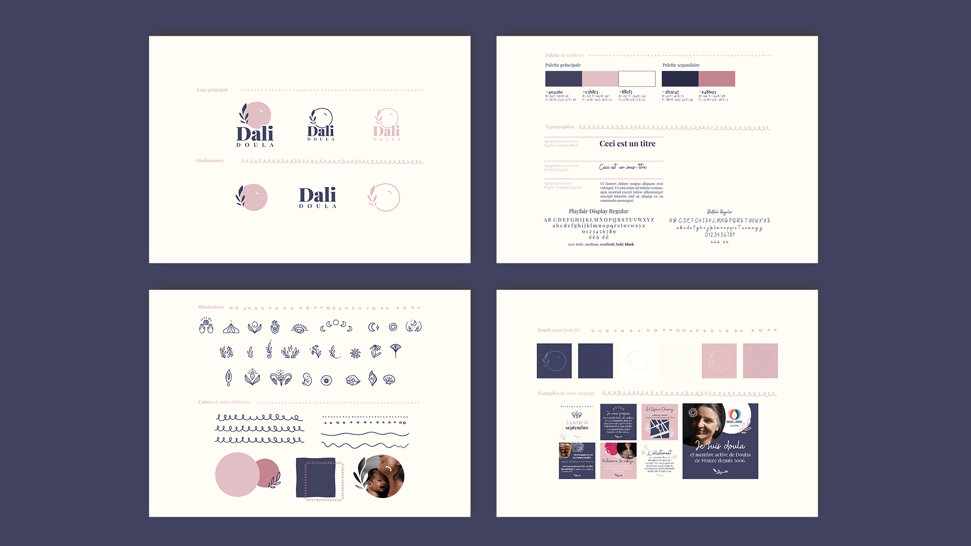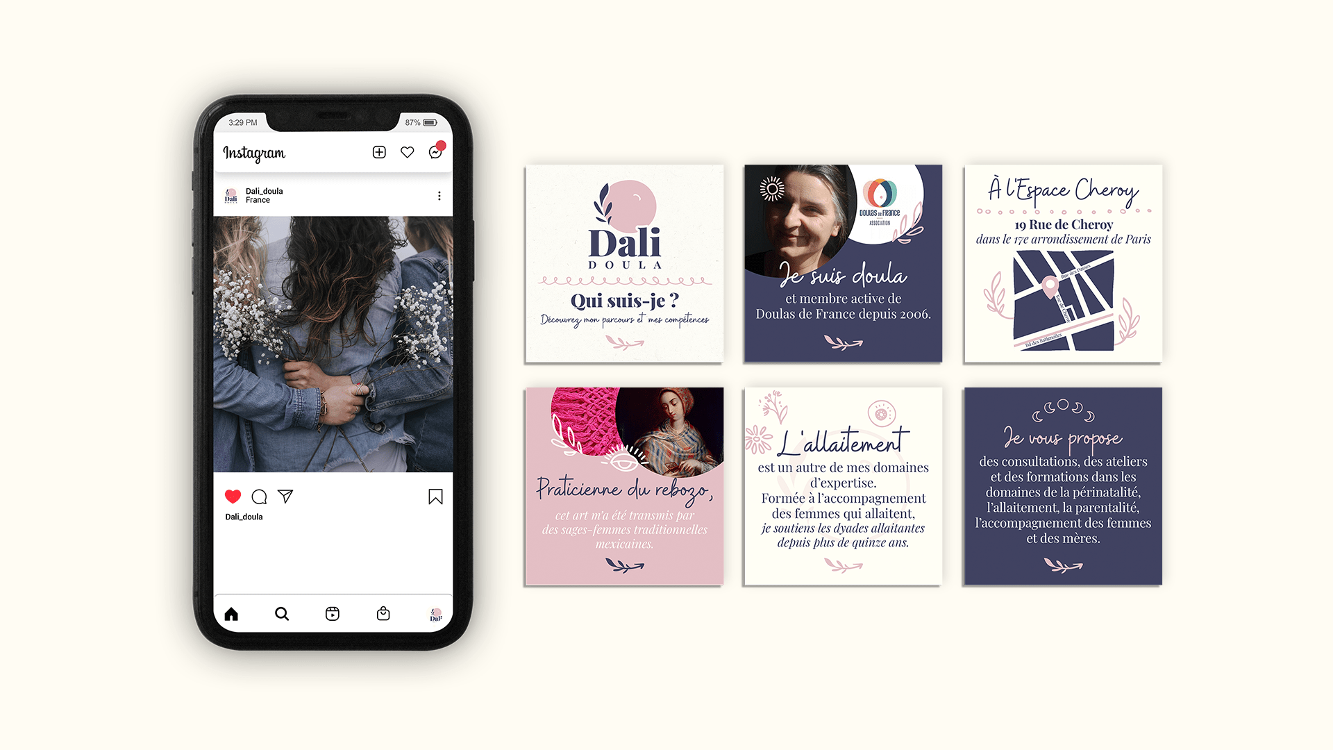 Prestations : Identité visuelle, publications et templates Instagram, dépliant 3 volets, carte de visite.